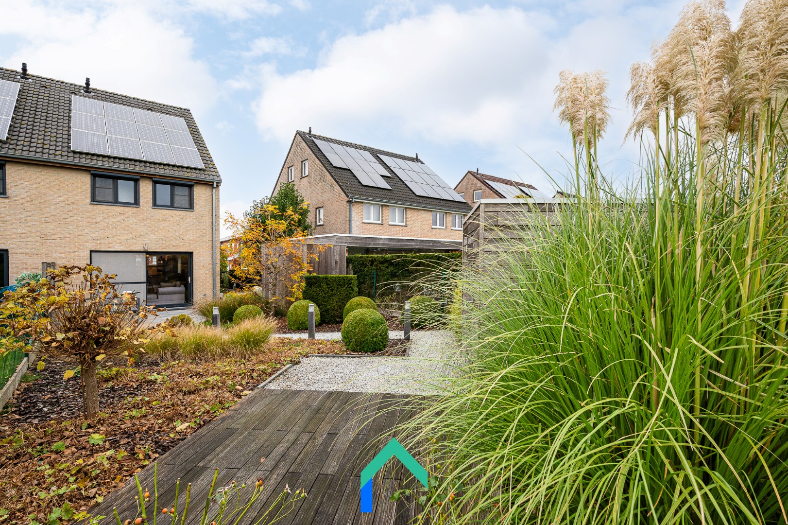 In de tuin zijn twee bijgebouwen voorzien: eentje dient als handige tuinberging, de andere is voorlopig voorzien van een infraroodcabine (die indien gewenst kan blijven staan). Door het halfopen karakter van de woning is er ook een poortje voorzien om langs de woning naar de voortuin te kunnen. Daar is ook een autostaanplaats te vinden. Tenslotte zijn er twee terrassen voorzien om optimaal te kunnen genieten van de zon.