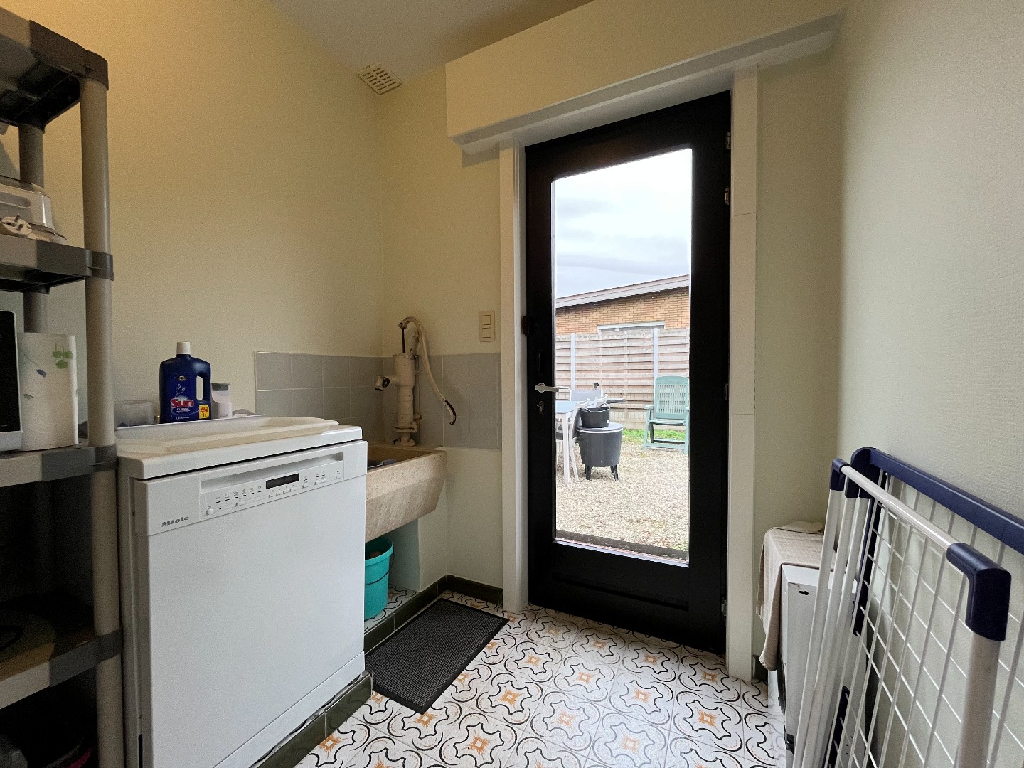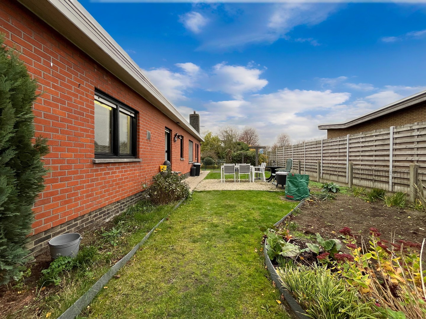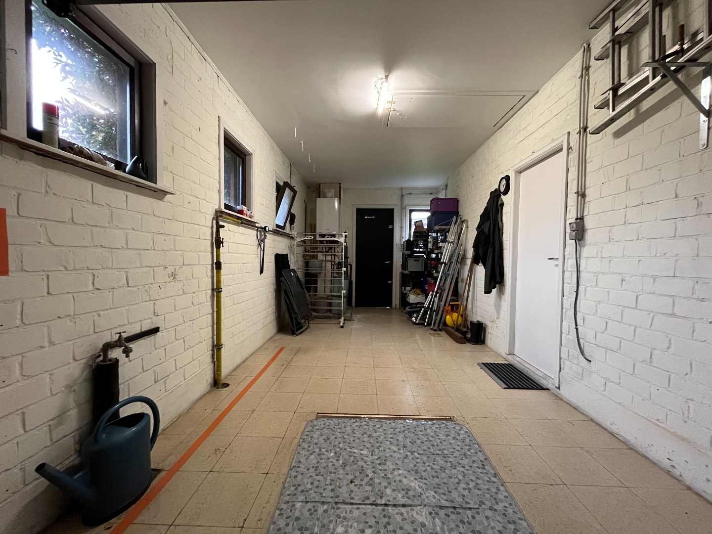 Bij binnenkomst word je verwelkomd in een ruime hal, voorzien van een apart toilet, die direct toegang biedt tot de verschillende leefruimtes. De lichtrijke en open opzet van de woon- en eetkamer creëert een gevoel van ruimte en verbondenheid. De keuken is praktisch ingericht en biedt voldoende ruimte. Aangrenzend aan de keuken bevindt zich een aparte berging die dienst kan doen als wasplaats, met directe toegang tot de tuin rondom de woning. De woning beschikt verder over twee ruime slaapkamers en een badkamer met ligbad. Als extra troef is er een ruime garage dat plaats biedt voor een voertuig en extra opbergruimte.