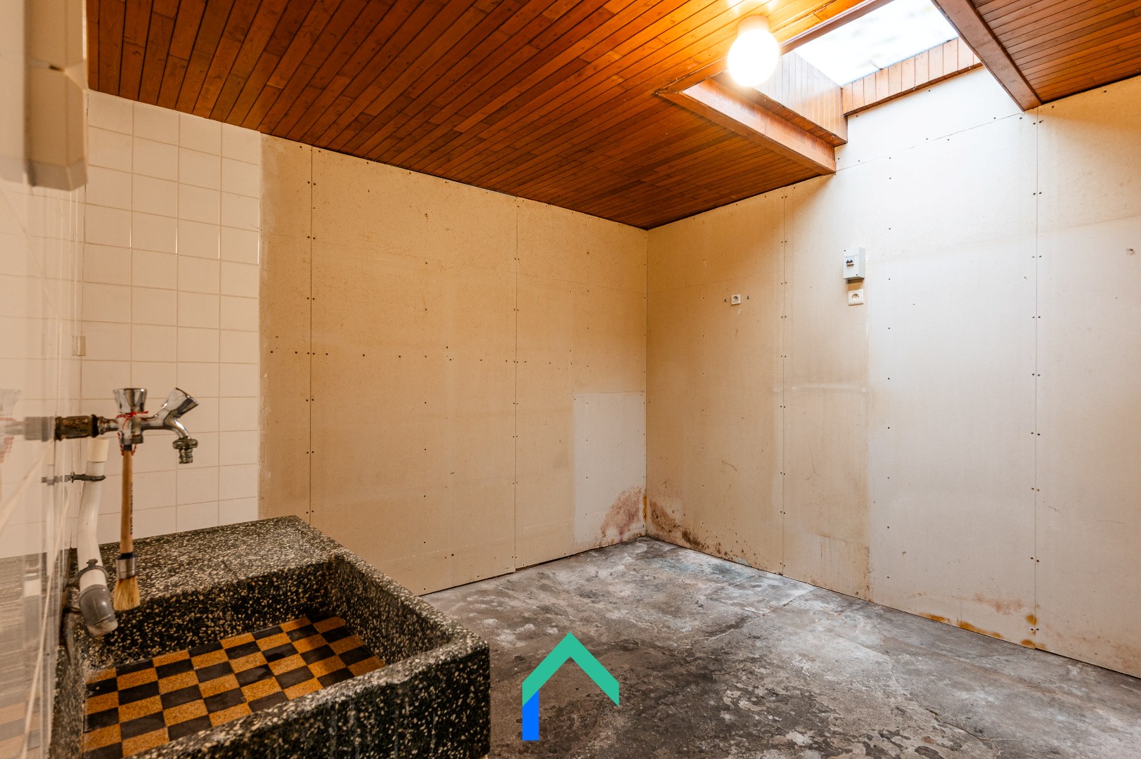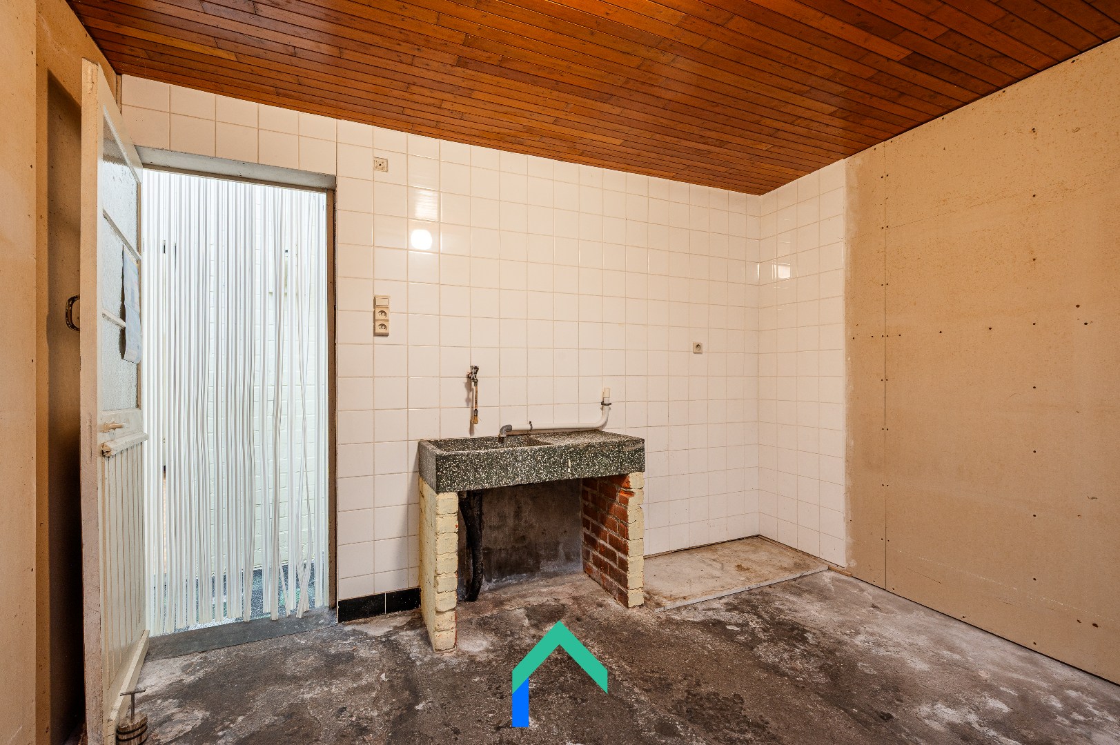 De woning heeft een bewoonbare oppervlakte van ongeveer 95 m² op een perceel van 75 m². Op het gelijkvloers kom je binnen in de leefruimte, een aangename plaats die kan omgevormd worden tot een warme thuis. Aansluitend bevindt zich een verrassende ruime keuken. Dankzij de lichtkoepel baadt deze ruimte in natuurlijk daglicht. Verder zijn er op dit niveau ook een berging, een apart toilet en de badkamer aanwezig. De structuur van het gelijkvloers laat toe om bij renovatie mooie open ruimtes te creëren en extra licht binnen te brengen.