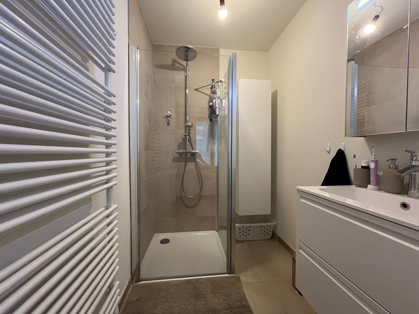 Op de tweede verdieping van de residentie Ascot betreedt u het appartement via een ruime inkomhal, waar strak maatwerk meteen de toon zet. Ingebouwde kasten bieden praktische opbergruimte en het apart toilet bevindt zich handig nabij de inkom. De leefruimte is een lichte en open plek waar de keuken, de eetruimte en de zithoek elkaar harmonieus aanvullen. De moderne keuken is volledig uitgerust met een combi-oven, inductiekookplaat, koelkast met vriesvak, vaatwasser en spoelbak, en vormt zo een functioneel geheel dat naadloos aansluit bij de rest van de ruimte. Dankzij de intelligente indeling van de eetruimte met ingebouwde zitbank ontstaat er een gezellige en functionele plek zonder verlies van ruimte. De woonkamer leidt rechtstreeks naar het zuidoostgerichte terras, waar u wordt getrakteerd op een bijzonder zicht. Het terras is toegankelijk zowel vanuit de leefruimte als de slaapkamer, wat het gevoel van openheid nog versterkt. De slaapkamer zelf is ruim met aansluitend een smaakvol afgewerkte badkamer voorzien van een inloopdouche en handdoekverwarmer. Een aparte berging doet dienst als wasruimte en houdt het appartement netjes en georganiseerd.