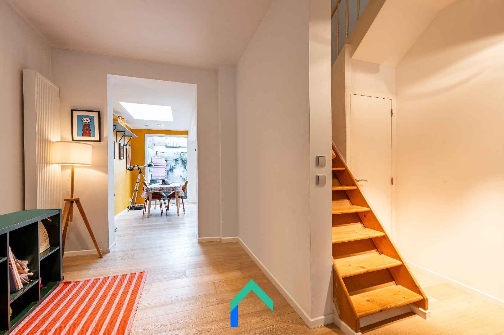 De leefruimte is opgebouwd uit drie zones: aan de voorzijde een gezellige zithoek, centraal een tussenruimte en achteraan de volledig ingerichte keuken. Grote ramen en een dakvenster zorgen voor een overvloed aan natuurlijk licht en een aangenaam zicht op de tuin. De keuken is praktisch ingericht en uitgerust met een inductiekookplaat, oven en vaatwasser. Op het gelijkvloers is er ook nog een apart gastentoilet.