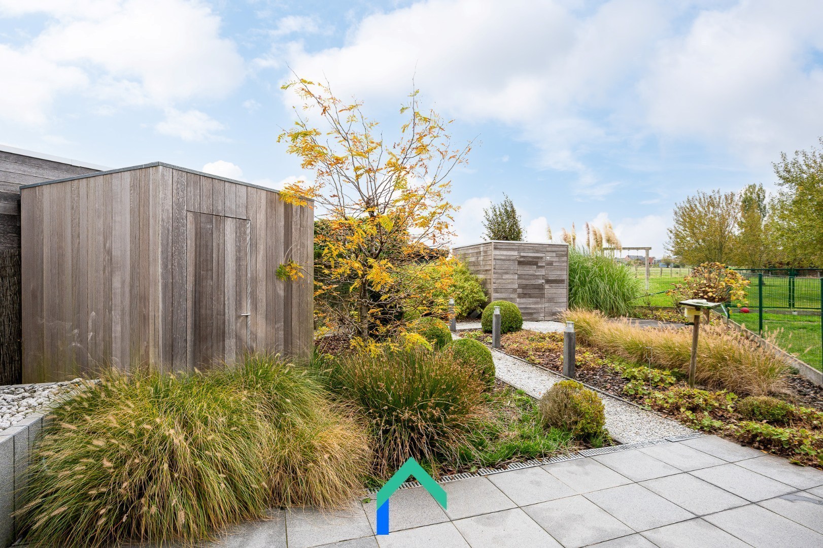 In de tuin zijn twee bijgebouwen voorzien: eentje dient als handige tuinberging, de andere is voorlopig voorzien van een infraroodcabine (die indien gewenst kan blijven staan). Door het halfopen karakter van de woning is er ook een poortje voorzien om langs de woning naar de voortuin te kunnen. Daar is ook een autostaanplaats te vinden. Tenslotte zijn er twee terrassen voorzien om optimaal te kunnen genieten van de zon.