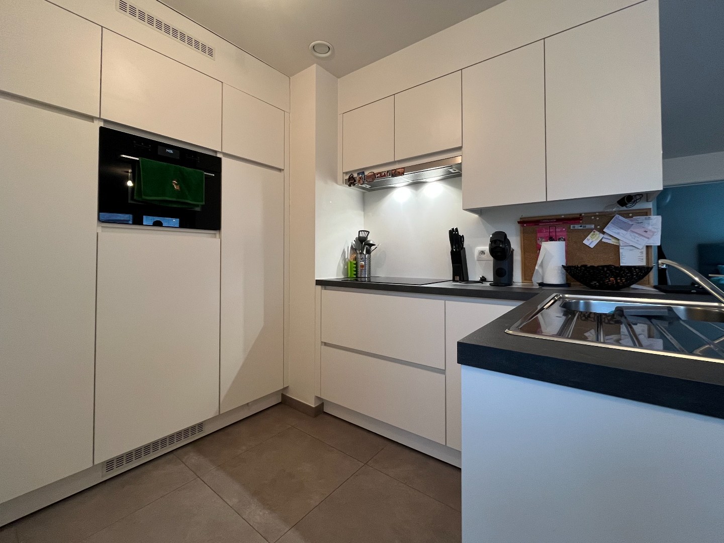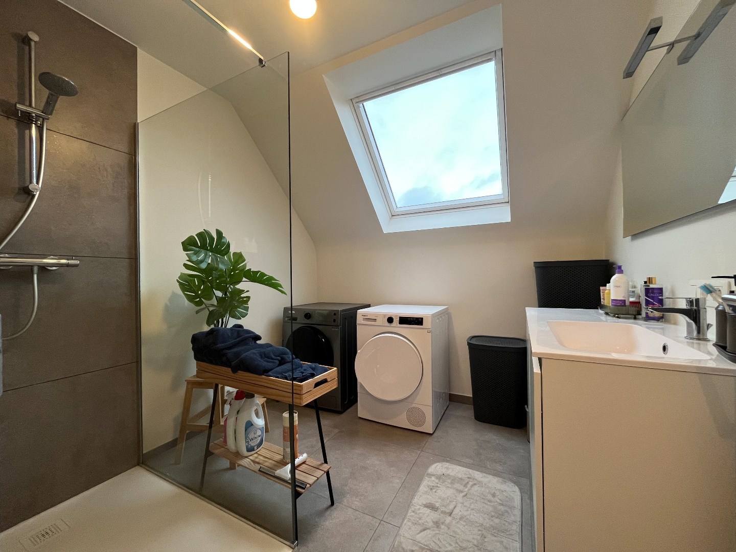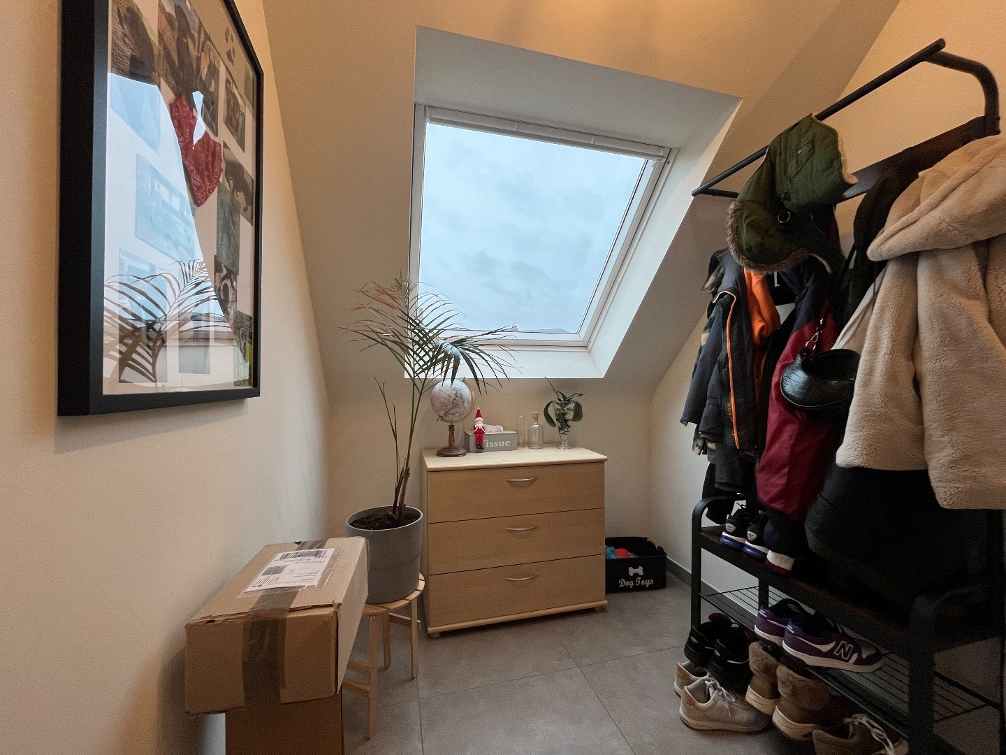 Bij het betreden van het appartement komt u meteen in de open leefruimte, waar grote raampartijen zorgen voor een aangename lichtinval en een moderne woonbeleving. De leefruimte sluit naadloos aan op de volledig ingerichte keuken, uitgerust met een koelkast, vaatwasser, combi-oven en een praktische berging. Via het schuifraam heb je toegang tot het zuidgericht terras, een fijne en private buitenruimte. Op dit niveau bevindt zich ook een ruime slaapkamer. Vanuit de hal heeft u toegang tot de badkamer met inloopdouche, waar eveneens plaats is voorzien voor een wasmachine. Er is ook nog een apart toilet. Via de trap bereikt u de bovenverdieping, waar zich nog twee slaapkamers bevinden die perfect kunnen dienen als kinderkamer, bureau of dressing. De grote dakvensters creëren hier een aangename sfeer en versterken het gevoel van ruimte en licht.