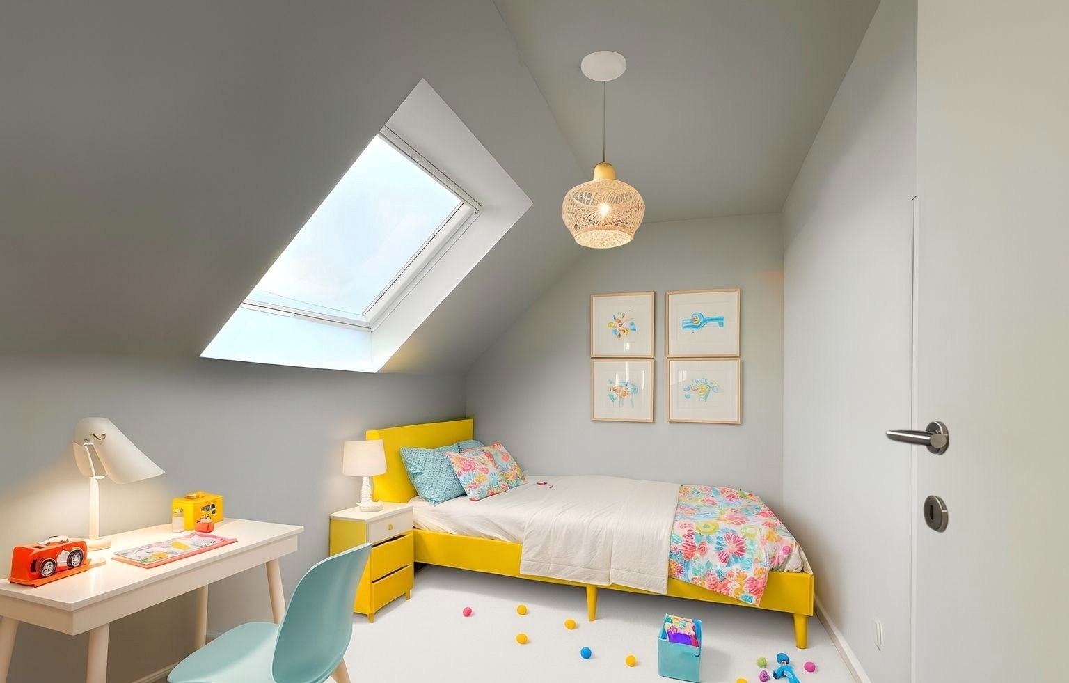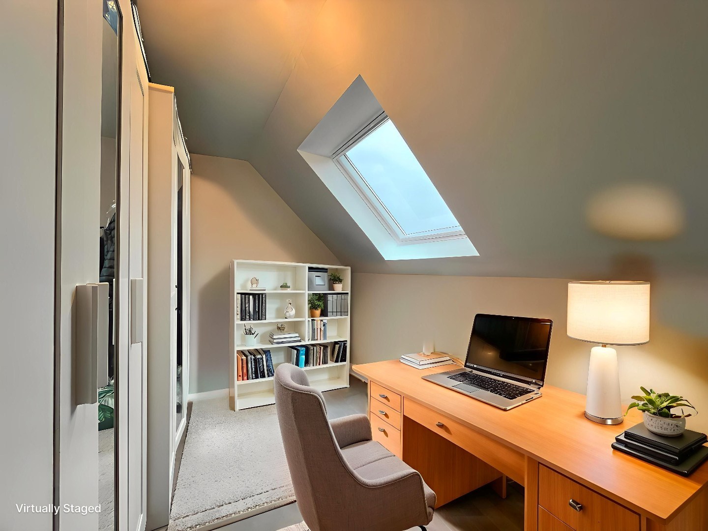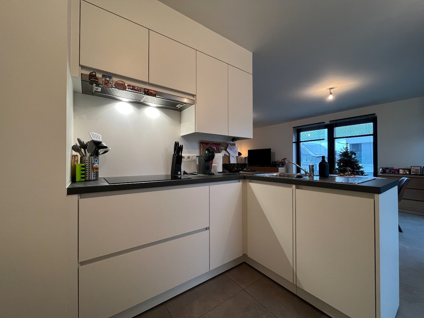 Bij het betreden van het appartement komt u meteen in de open leefruimte, waar grote raampartijen zorgen voor een aangename lichtinval en een moderne woonbeleving. De leefruimte sluit naadloos aan op de volledig ingerichte keuken, uitgerust met een koelkast, vaatwasser, combi-oven en een praktische berging. Via het schuifraam heb je toegang tot het zuidgericht terras, een fijne en private buitenruimte. Op dit niveau bevindt zich ook een ruime slaapkamer. Vanuit de hal heeft u toegang tot de badkamer met inloopdouche, waar eveneens plaats is voorzien voor een wasmachine. Er is ook nog een apart toilet. Via de trap bereikt u de bovenverdieping, waar zich nog twee slaapkamers bevinden die perfect kunnen dienen als kinderkamer, bureau of dressing. De grote dakvensters creëren hier een aangename sfeer en versterken het gevoel van ruimte en licht.