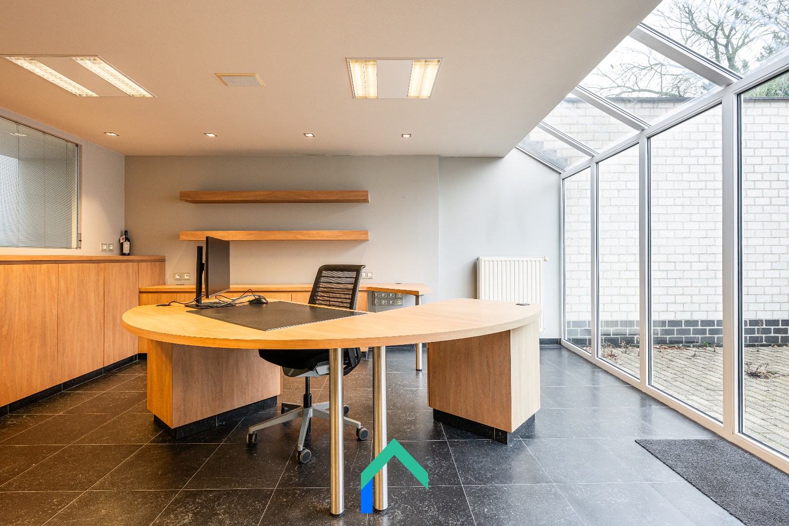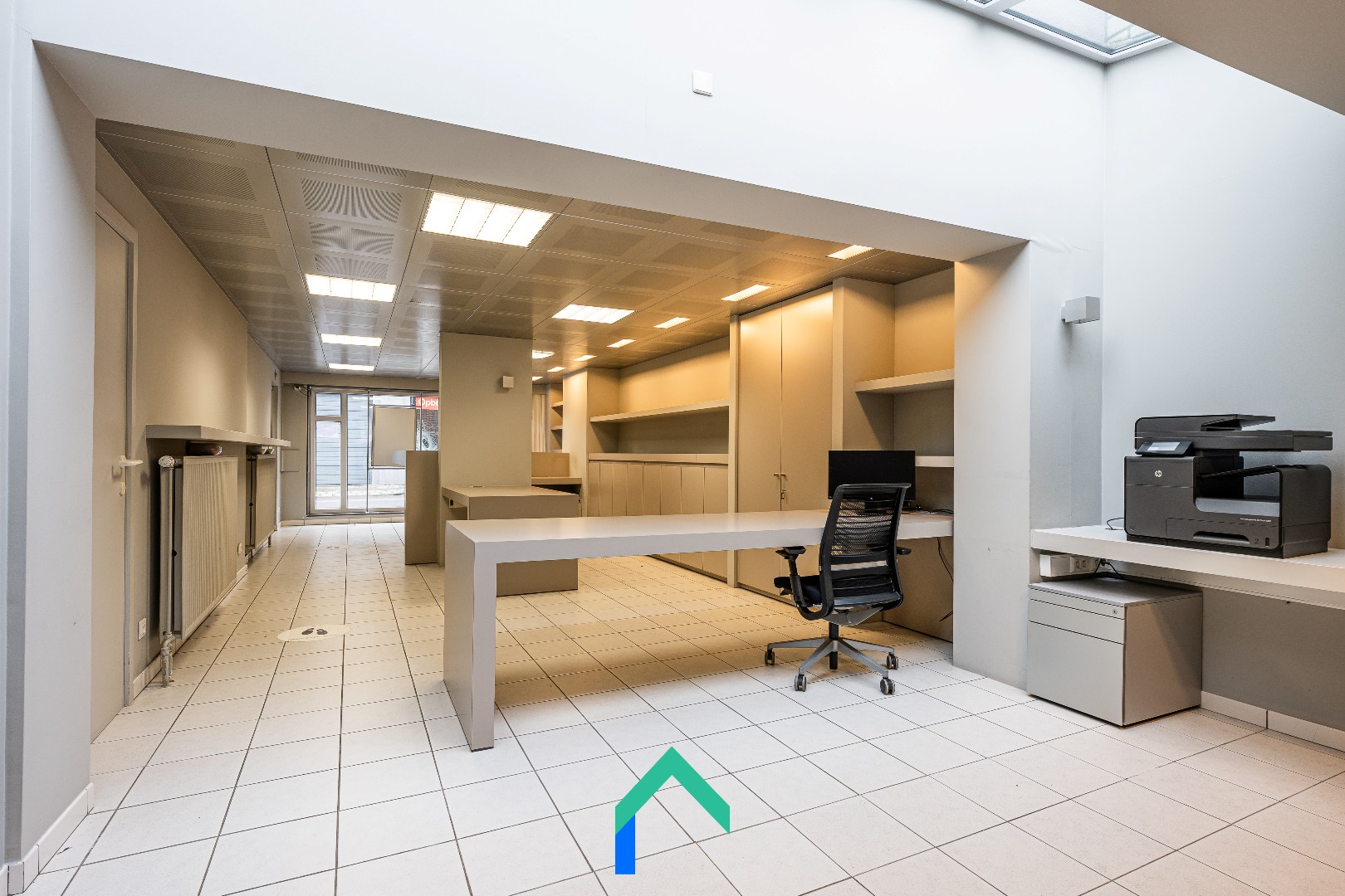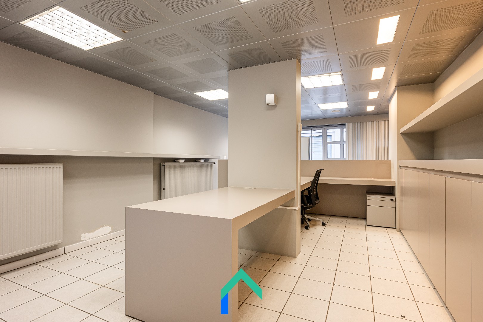 De handelsruimte op het gelijkvloers werd momenteel ingericht als verzekeringskantoor en presenteert zich volledig instapklaar. Via de inkomhal komt u terecht in een ontvangstruimte met aansluitend twee kantoorruimtes, uitgerust met op maat gemaakte bureaus en kasten. Beide kantoorruimtes genieten van een aangename en natuurlijke lichtinval dankzij de combinatie van een lichtkoepel en grote raampartijen aan zowel de voor- als achterzijde van het gebouw. Verder beschikt de ruimte over een praktische kitchenette, berging en kelder, wat zorgt voor extra opslagmogelijkheden. Het aangename terras achteraan biedt bovendien een rustige en private buitenruimte. Het is onmiddellijk beschikbaar, waardoor een nieuwe activiteit hier zonder zorgen kan worden opgestart.