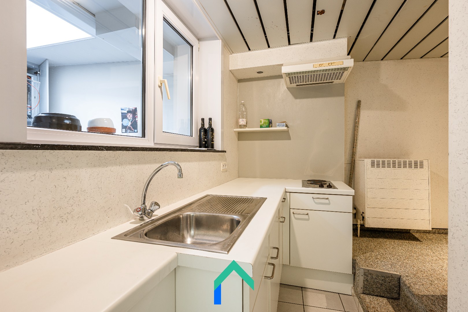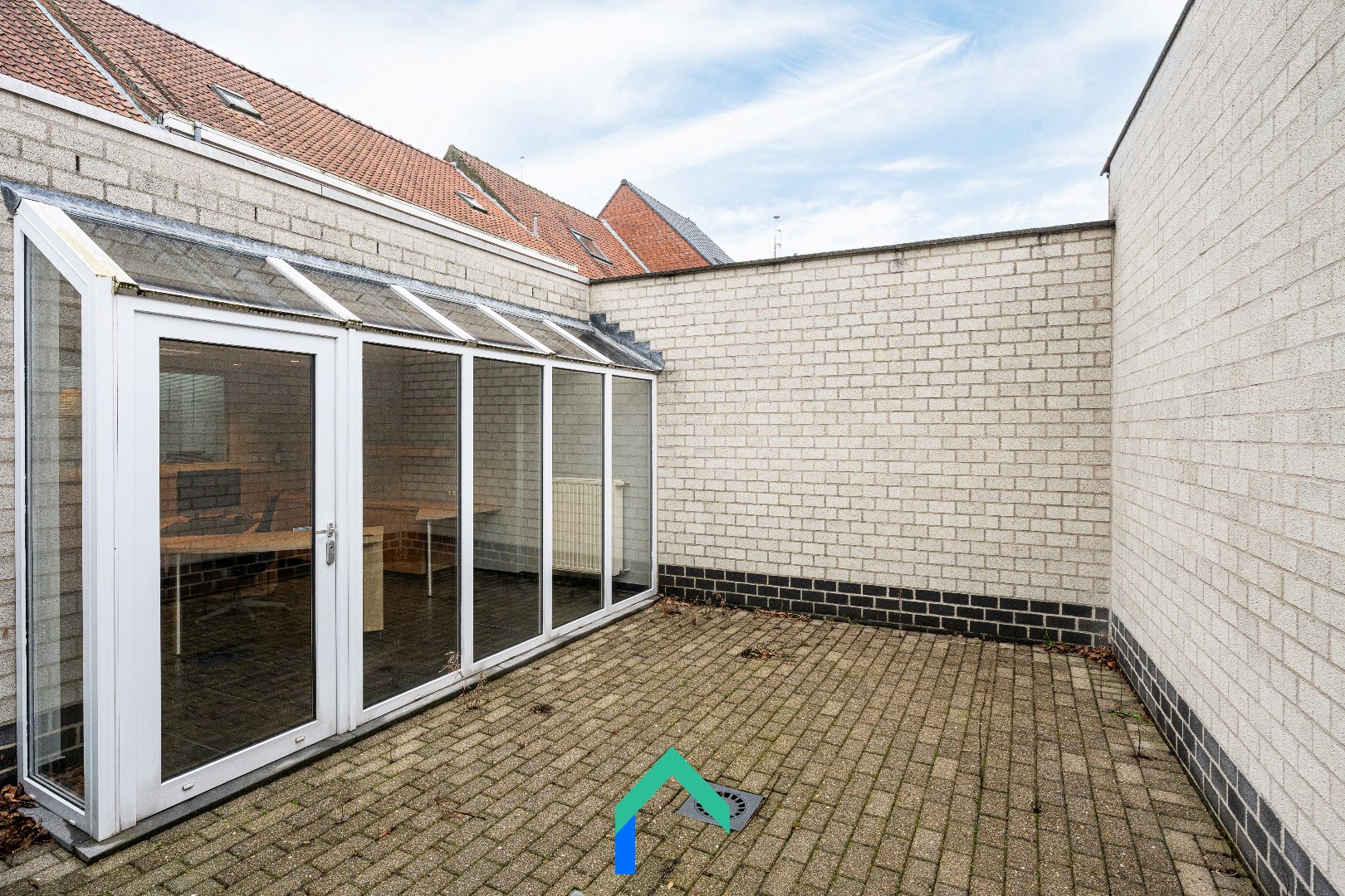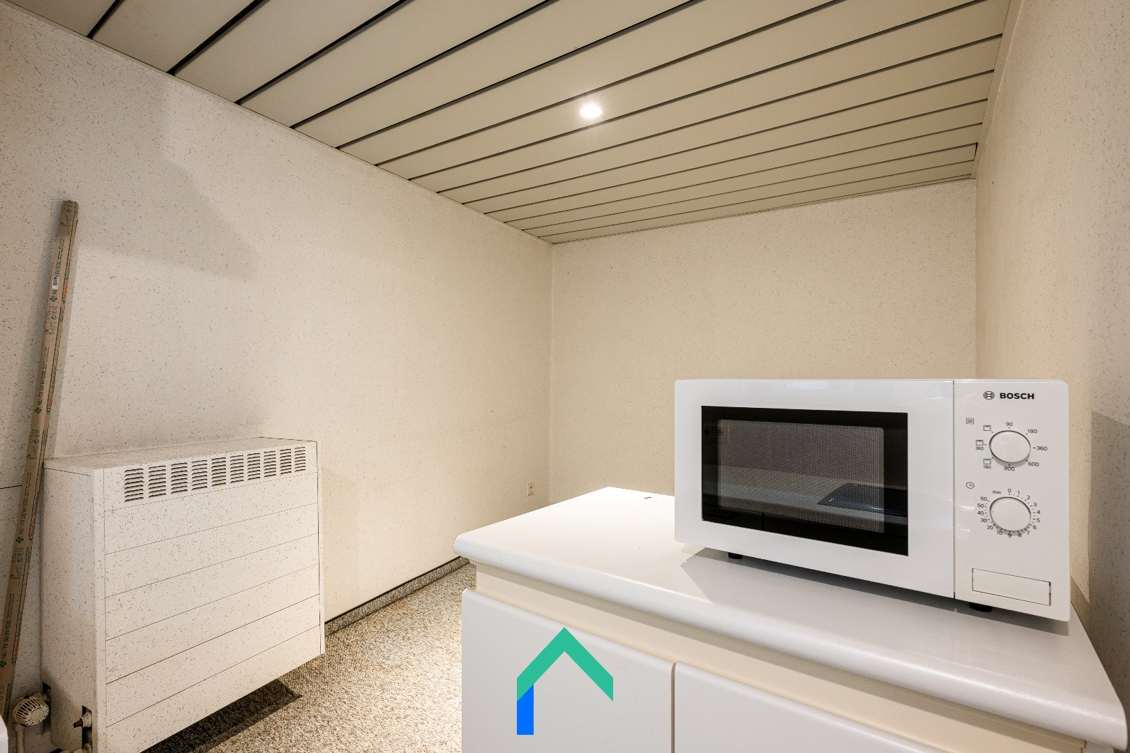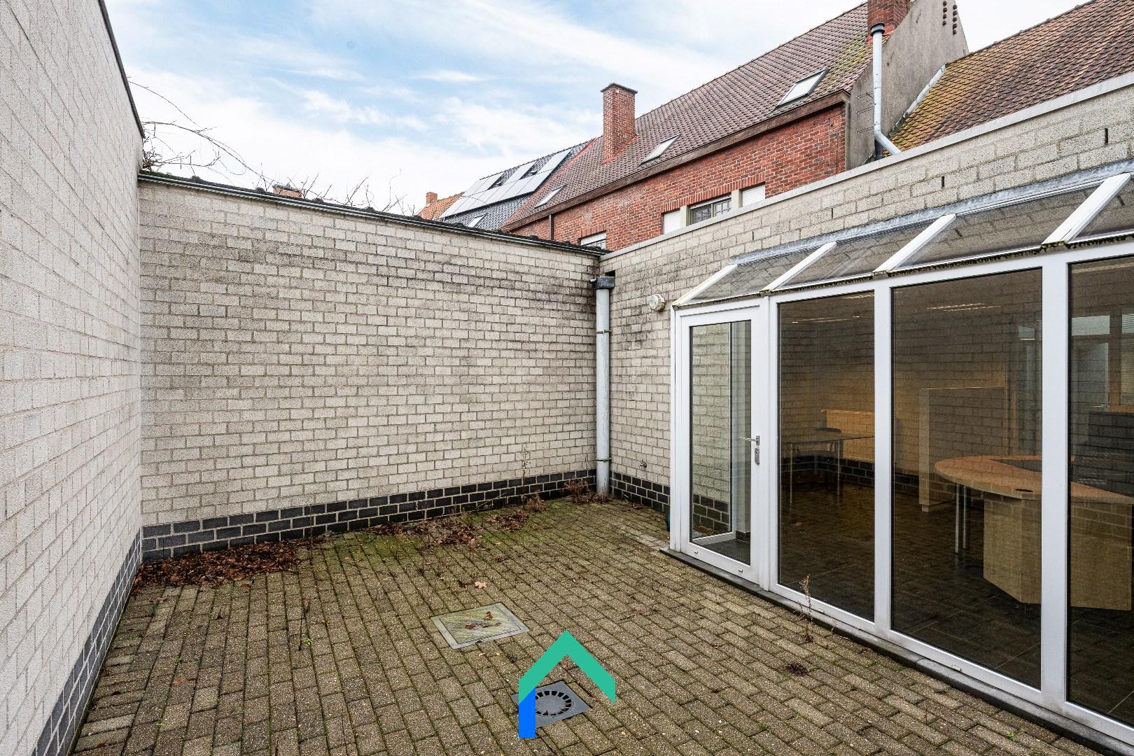 De handelsruimte op het gelijkvloers werd momenteel ingericht als verzekeringskantoor en presenteert zich volledig instapklaar. Via de inkomhal komt u terecht in een ontvangstruimte met aansluitend twee kantoorruimtes, uitgerust met op maat gemaakte bureaus en kasten. Beide kantoorruimtes genieten van een aangename en natuurlijke lichtinval dankzij de combinatie van een lichtkoepel en grote raampartijen aan zowel de voor- als achterzijde van het gebouw. Verder beschikt de ruimte over een praktische kitchenette, berging en kelder, wat zorgt voor extra opslagmogelijkheden. Het aangename terras achteraan biedt bovendien een rustige en private buitenruimte. Het is onmiddellijk beschikbaar, waardoor een nieuwe activiteit hier zonder zorgen kan worden opgestart.