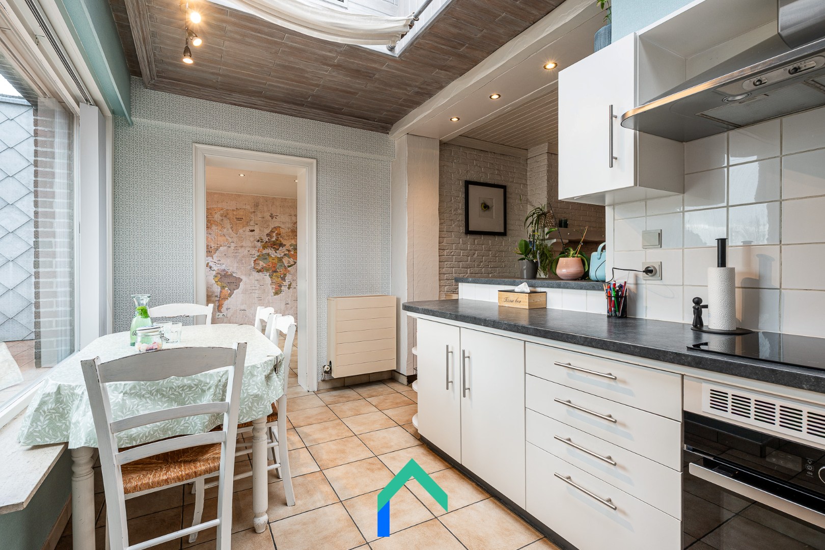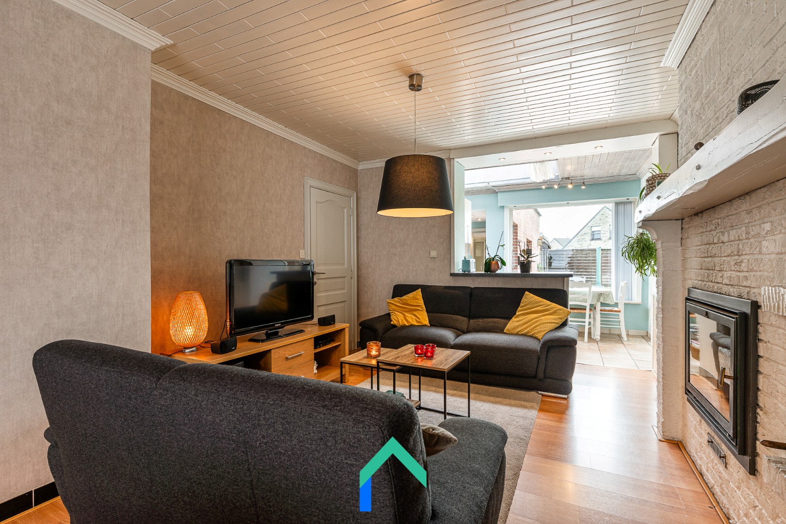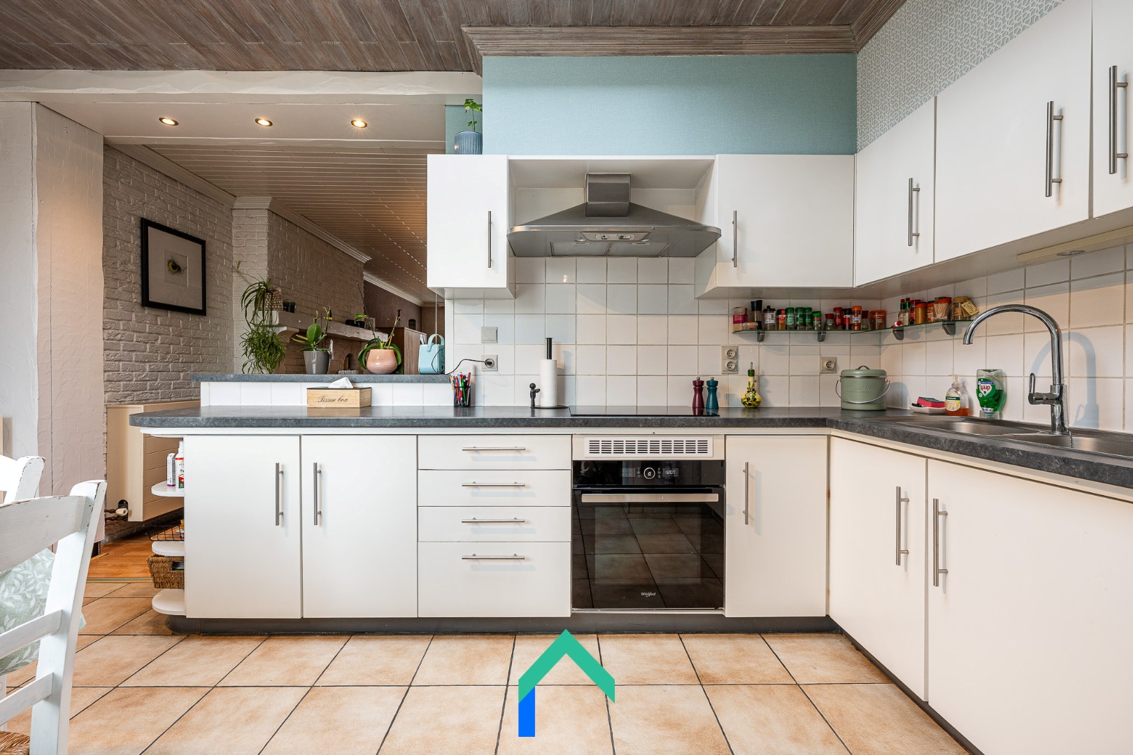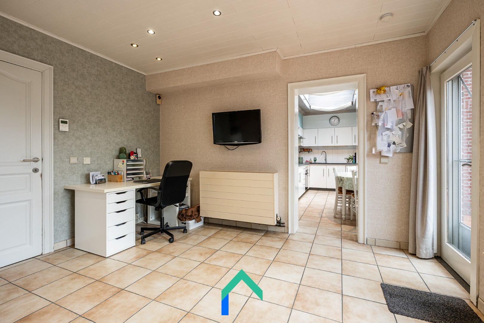 We komen binnen via de inkomhal die toegang geeft tot de leefruimte. De leefruimte is afgewerkt met een warme laminaatvloer. De gezelligheid wordt nog extra benadrukt door de inbouw houthaard. De keuken staat in verbinding met de leefruimte en heeft ook een aangenaam zicht op de tuin. De keuken is onder andere voorzien van een recente inductiekookplaat en oven (2023). Vanuit de keuken kunnen we enerzijds naar de bijkeuken en badkamer. De badkamer is uitgerust met een lavabo, ligbad, WC en douche. Langs de andere kant van de keuken vinden we nog een multifunctionele ruimte die op dit moment gebruikt wordt als bureau. Van daaruit kunnen we de garage betreden die beschikt over een automatische sectionaalpoort.