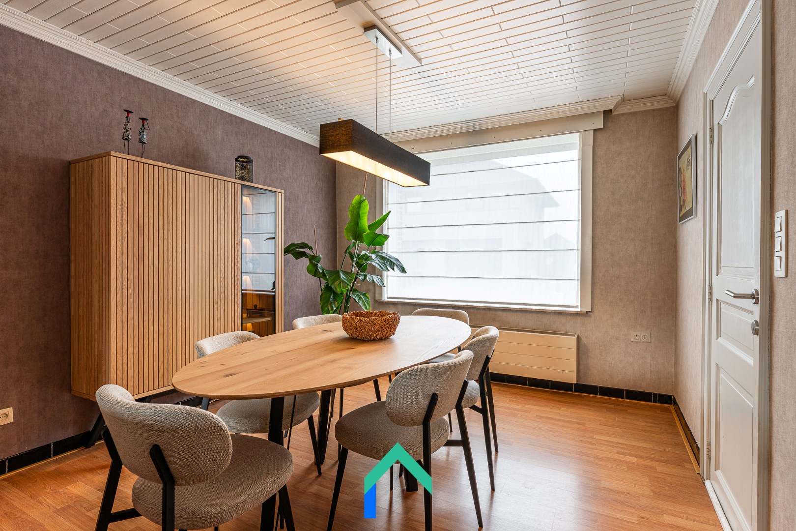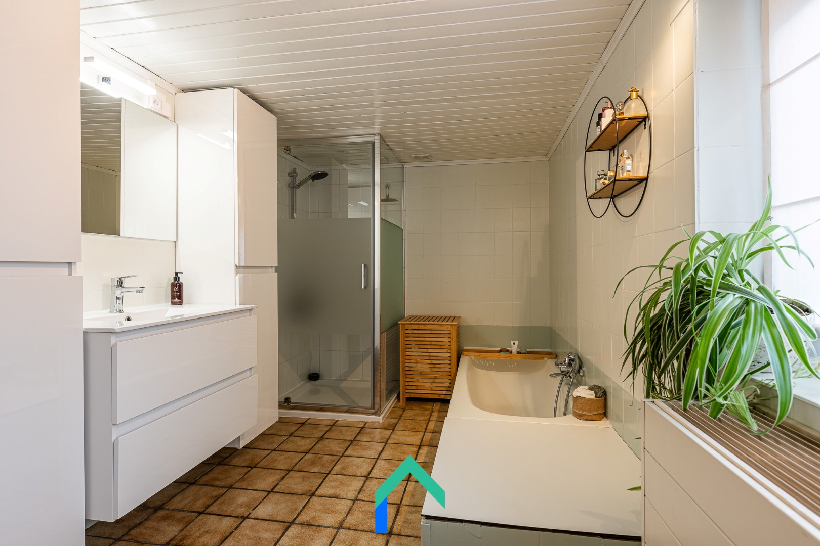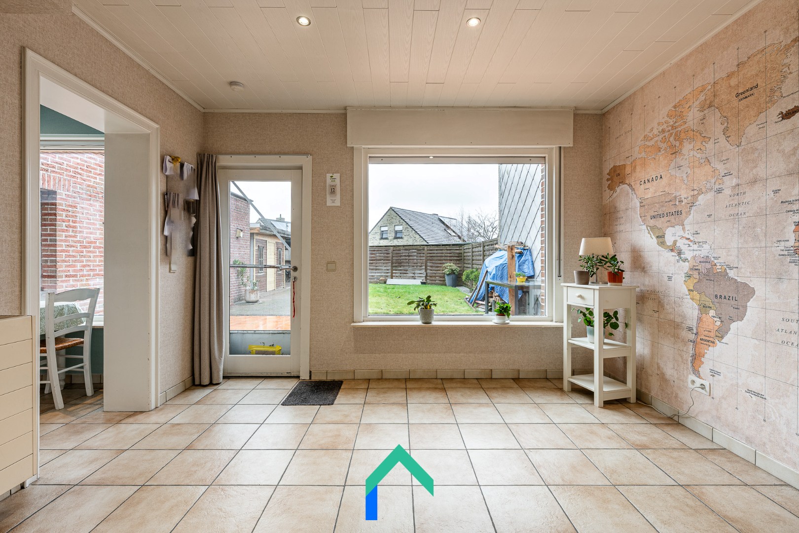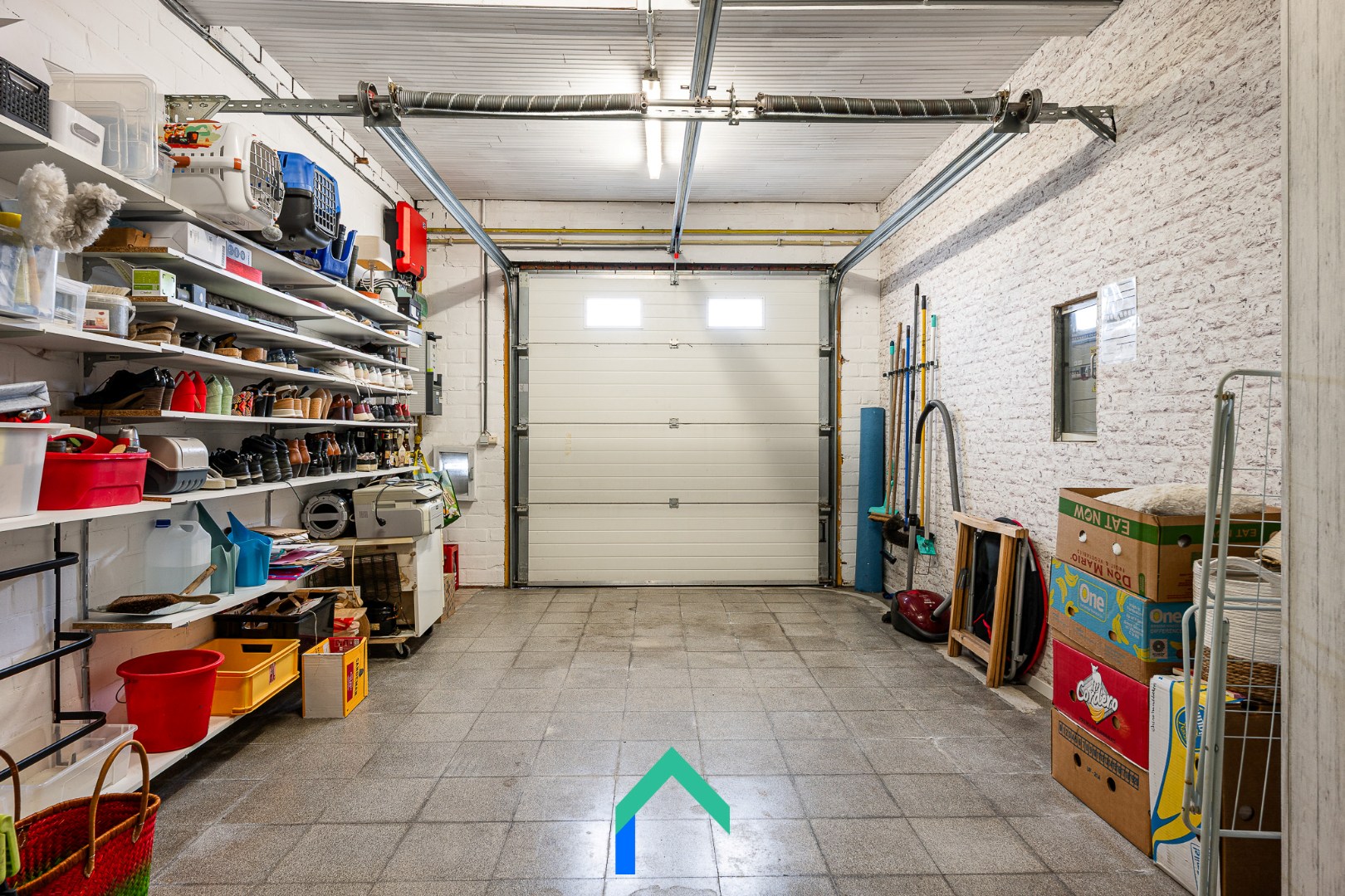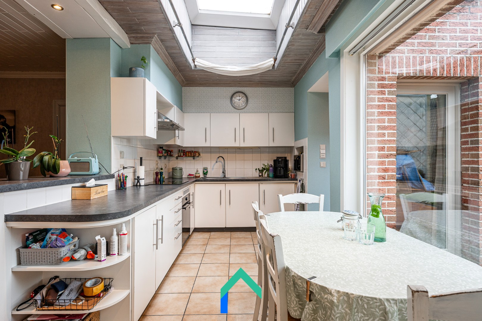 We komen binnen via de inkomhal die toegang geeft tot de leefruimte. De leefruimte is afgewerkt met een warme laminaatvloer. De gezelligheid wordt nog extra benadrukt door de inbouw houthaard. De keuken staat in verbinding met de leefruimte en heeft ook een aangenaam zicht op de tuin. De keuken is onder andere voorzien van een recente inductiekookplaat en oven (2023). Vanuit de keuken kunnen we enerzijds naar de bijkeuken en badkamer. De badkamer is uitgerust met een lavabo, ligbad, WC en douche. Langs de andere kant van de keuken vinden we nog een multifunctionele ruimte die op dit moment gebruikt wordt als bureau. Van daaruit kunnen we de garage betreden die beschikt over een automatische sectionaalpoort.