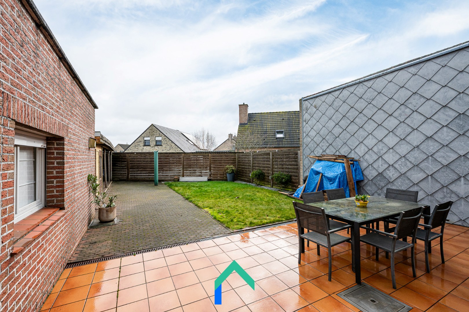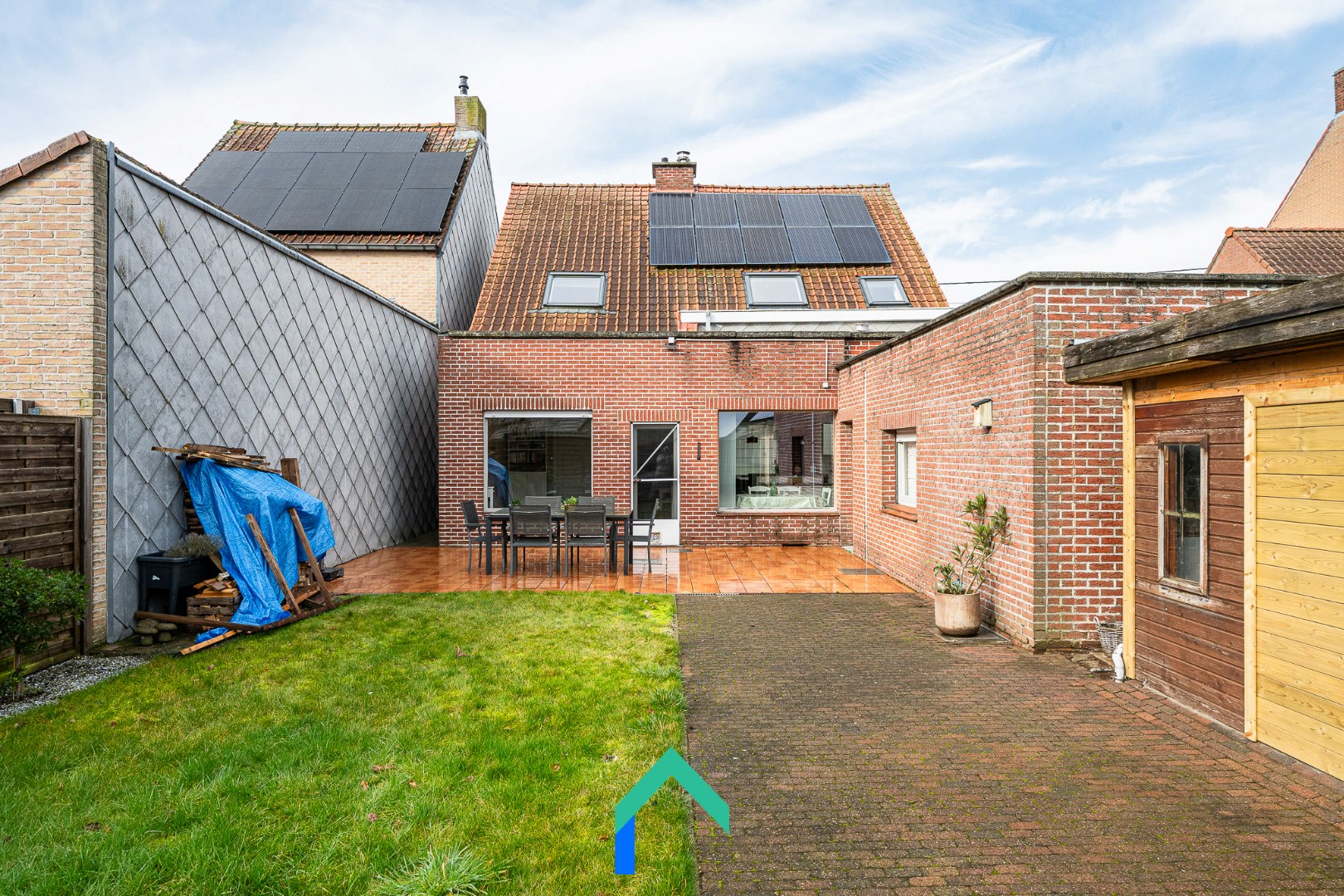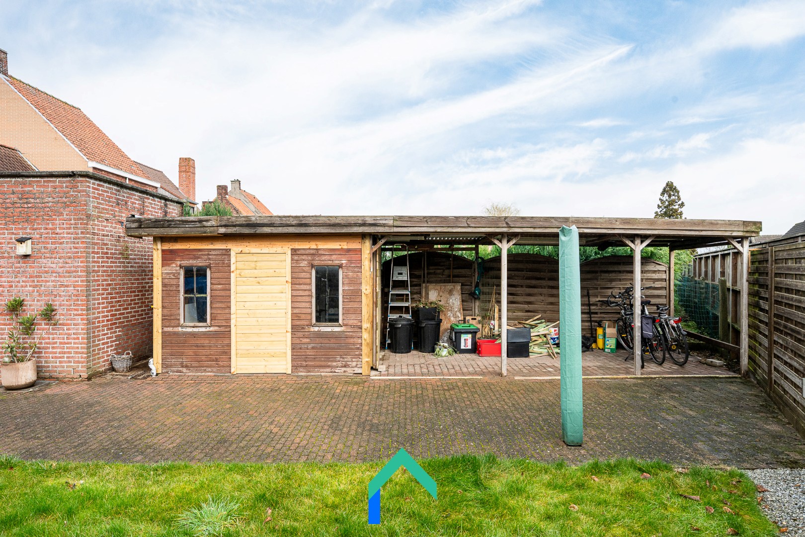 De tuin vormt een heerlijke plek om volop te genieten van zonnige dagen dankzij de gunstige zuidoostelijke oriëntatie. Via de praktische zij-ingang naast de woning is de tuin bovendien rechtstreeks toegankelijk. Ideaal om groenafval of materiaal naar buiten te brengen zonder het leefgedeelte te moeten betreden. Achteraan bevindt zich nog een tuinhuis en een handige overdekte zone, perfect voor het stallen van fietsen of extra bergruimte.