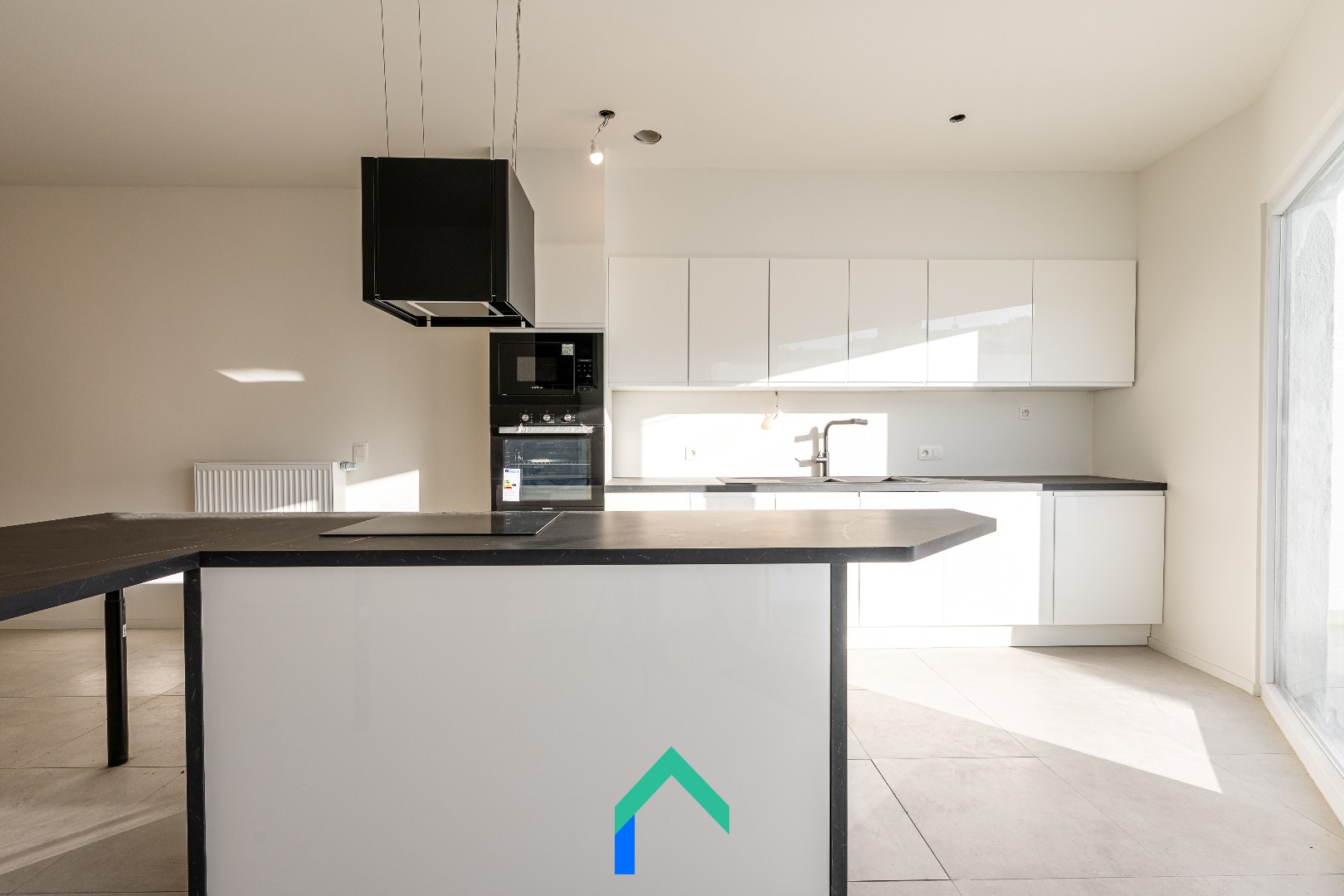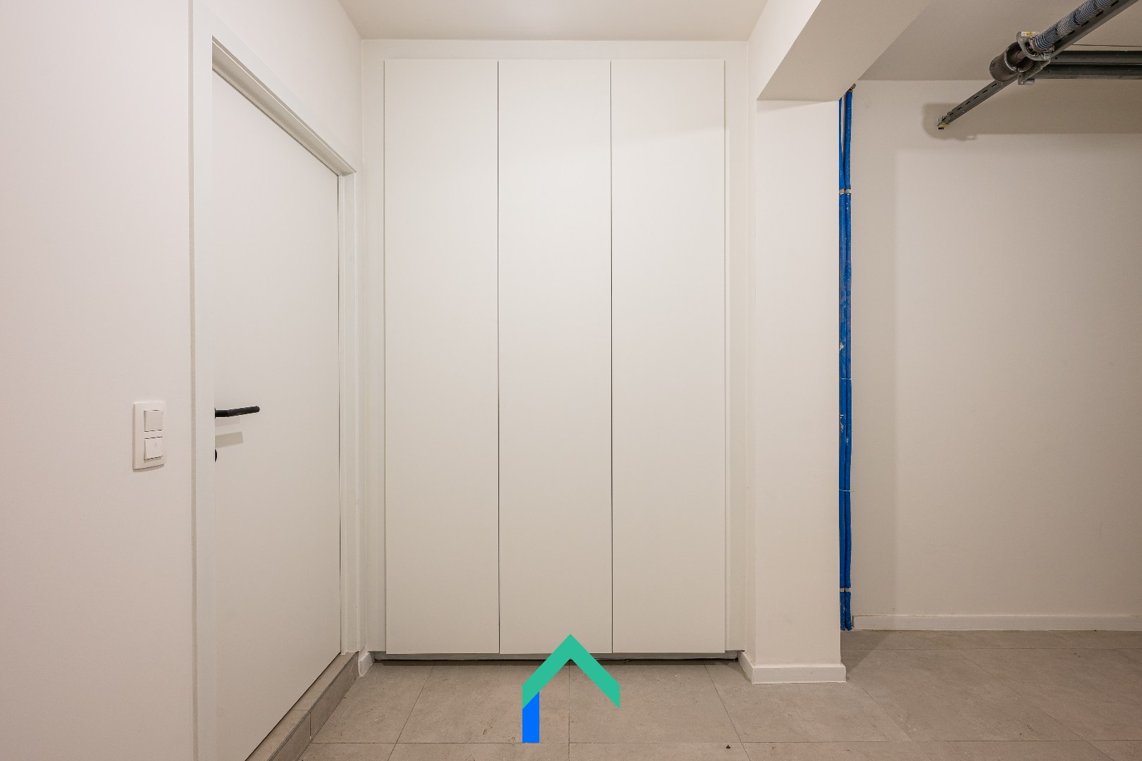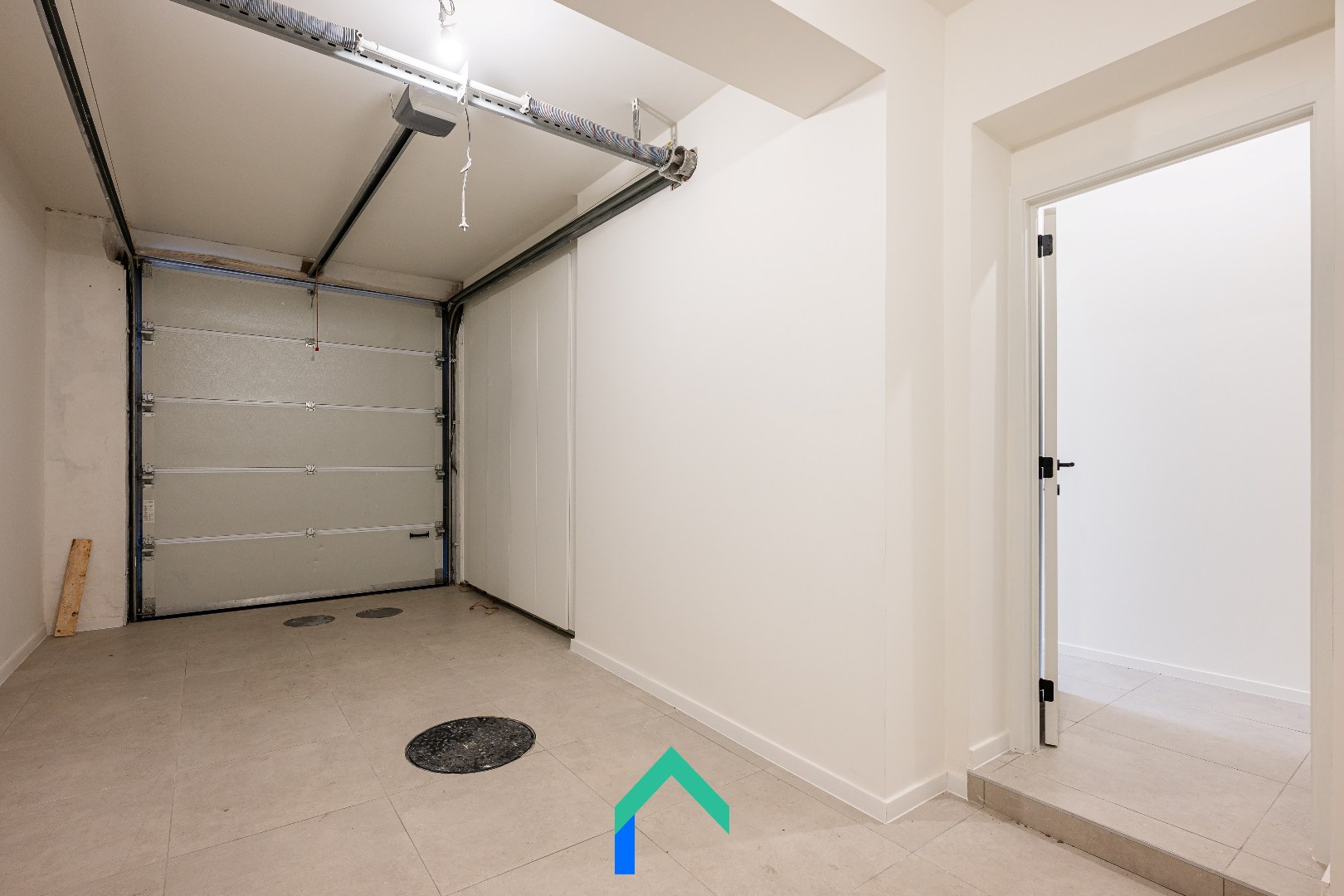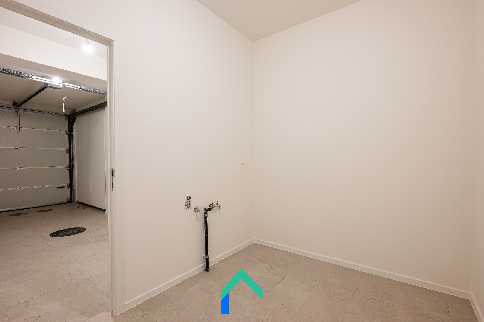 Bij het betreden van de woning kom je terecht in een inkomhal met gastentoilet en een aparte toegang tot de garage. Meteen valt de moderne en strakke afwerking op, die doorheen de volledige woning werd doorgetrokken. Verder kom je in de ruime leefruimte met open keuken die een mooi zicht biedt op de tuin en het terras. Deze lichtrijke leefruimte vormt het centrale punt van de woning en creëert een aangename verbinding tussen binnen en buiten. Tussen de keuken en de garage bevindt zich een praktische en ruime wasplaats, ideaal voor extra bergruimte en huishoudelijk comfort. De garage met automatische sectionaalpoort biedt plaats aan één wagen en beschikt daarnaast over voldoende opslagmogelijkheden.