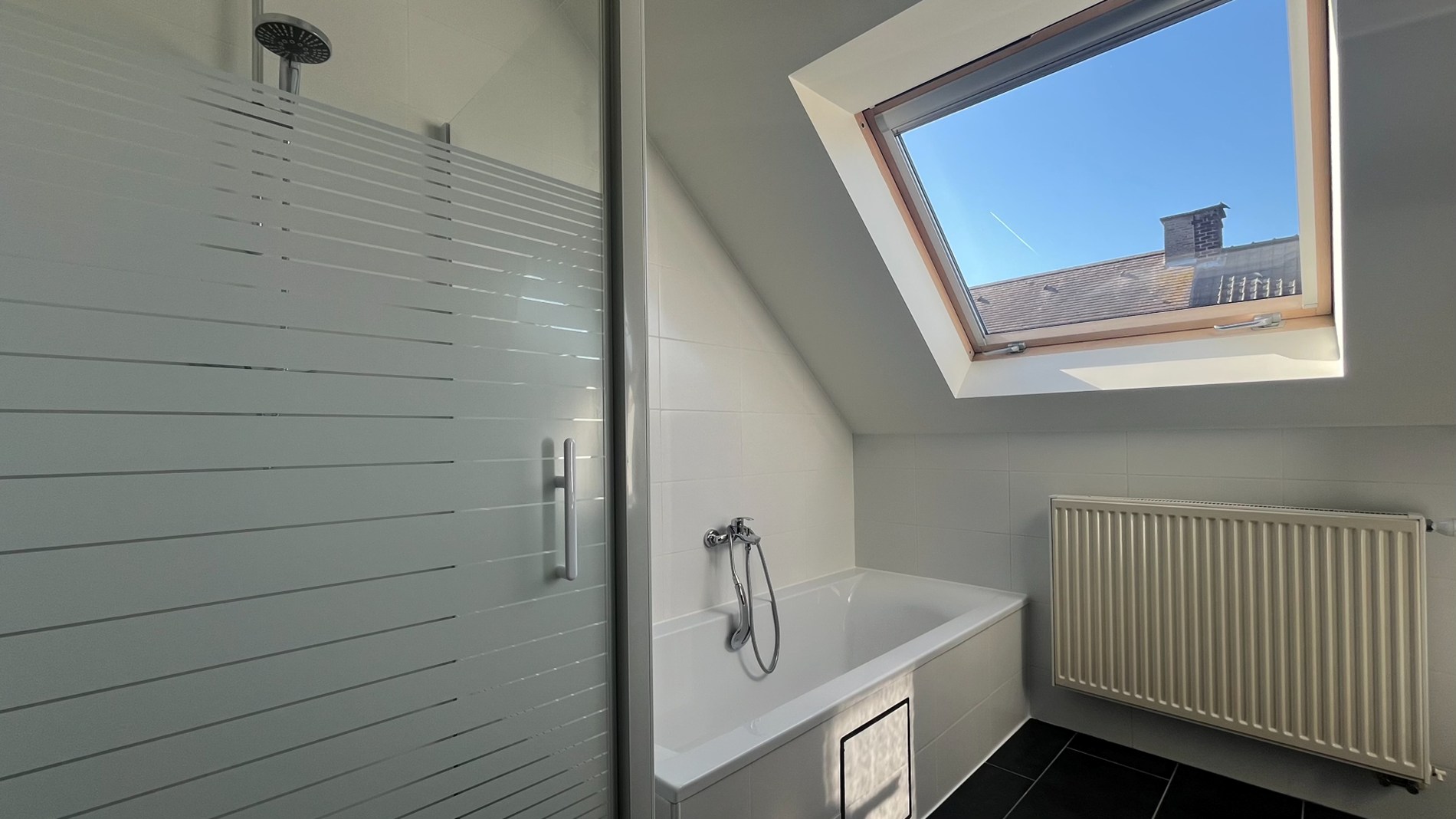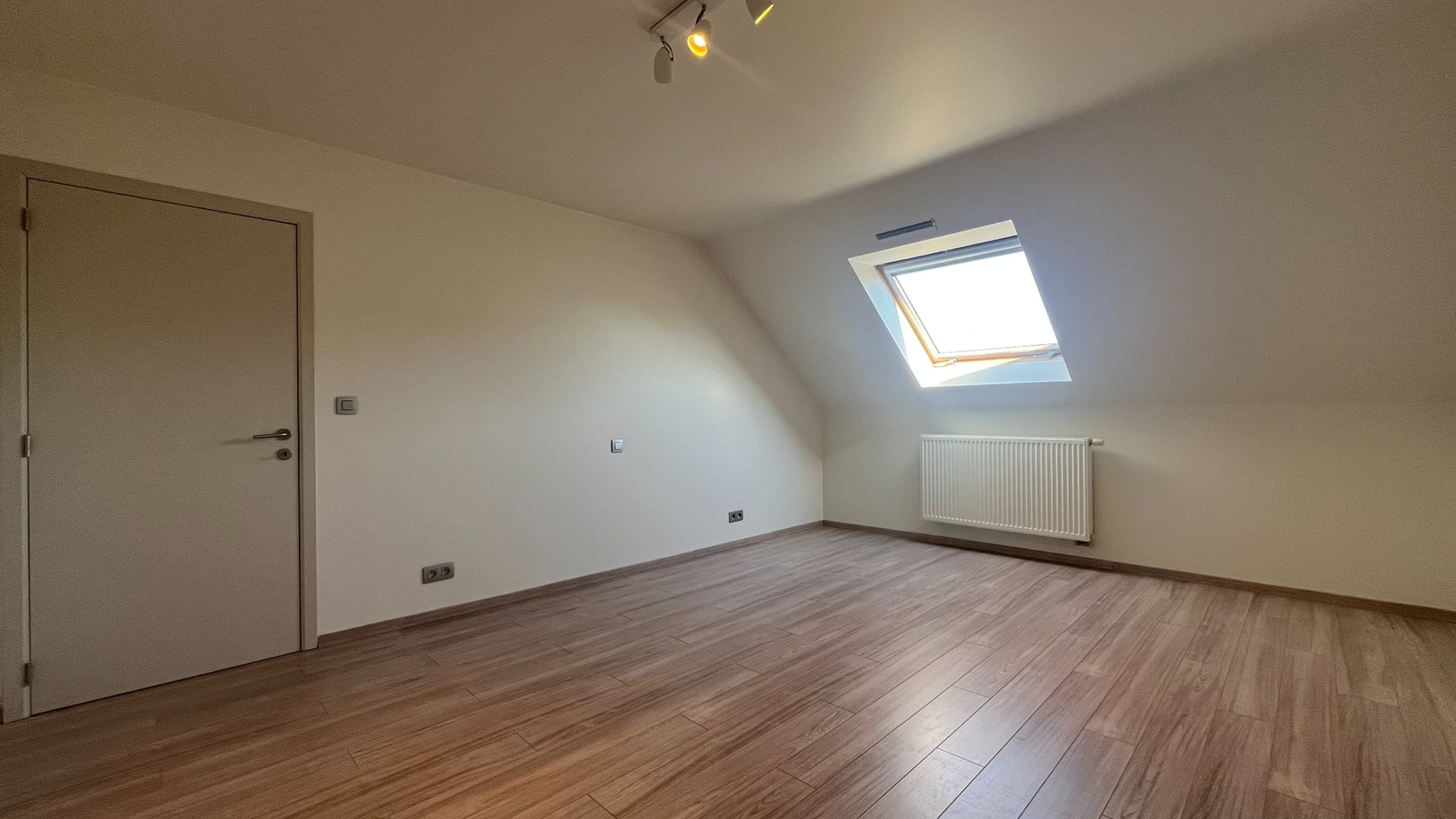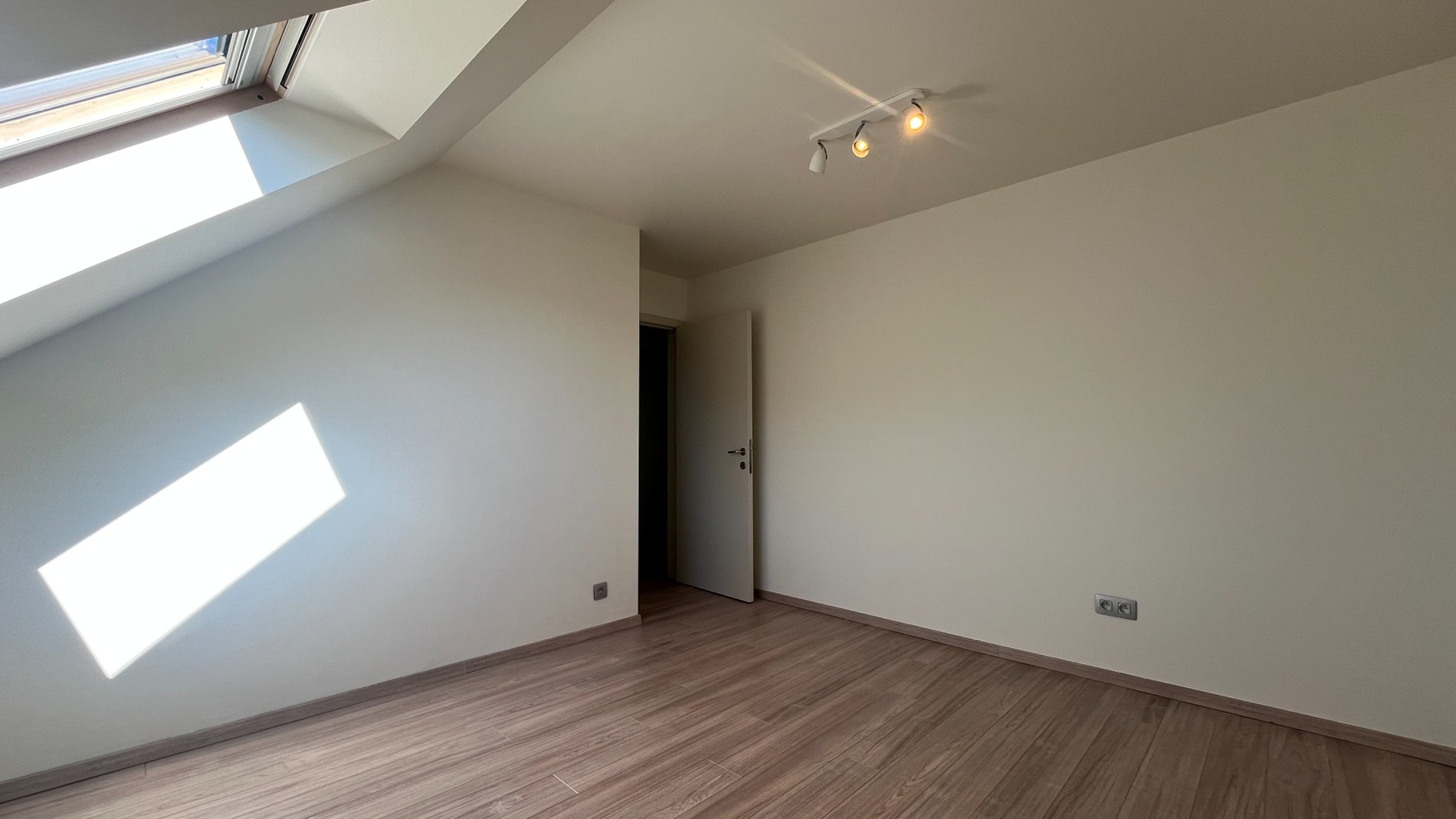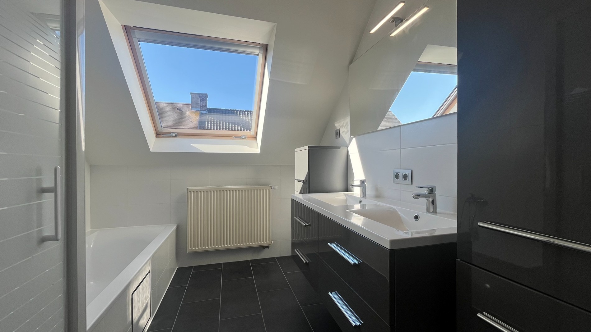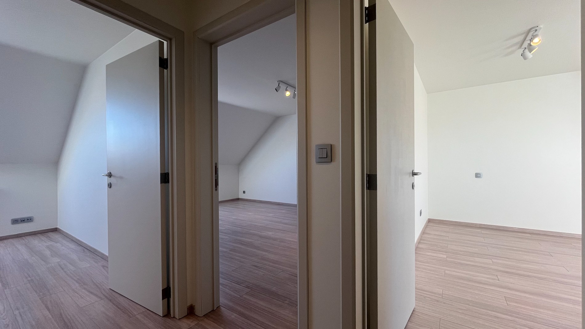 Op de tweede verdieping bevinden zich drie volwaardige slaapkamers, waaronder een ruime master bedroom van maar liefst 20m2. De badkamer is compleet ingericht met een bad, douche en dubbele lavabo. Alle kamers zijn uitgerust met grote Veluxramen, wat zorgt voor een aangename lichtinval. Extra opbergruimte vind je op de zolder.